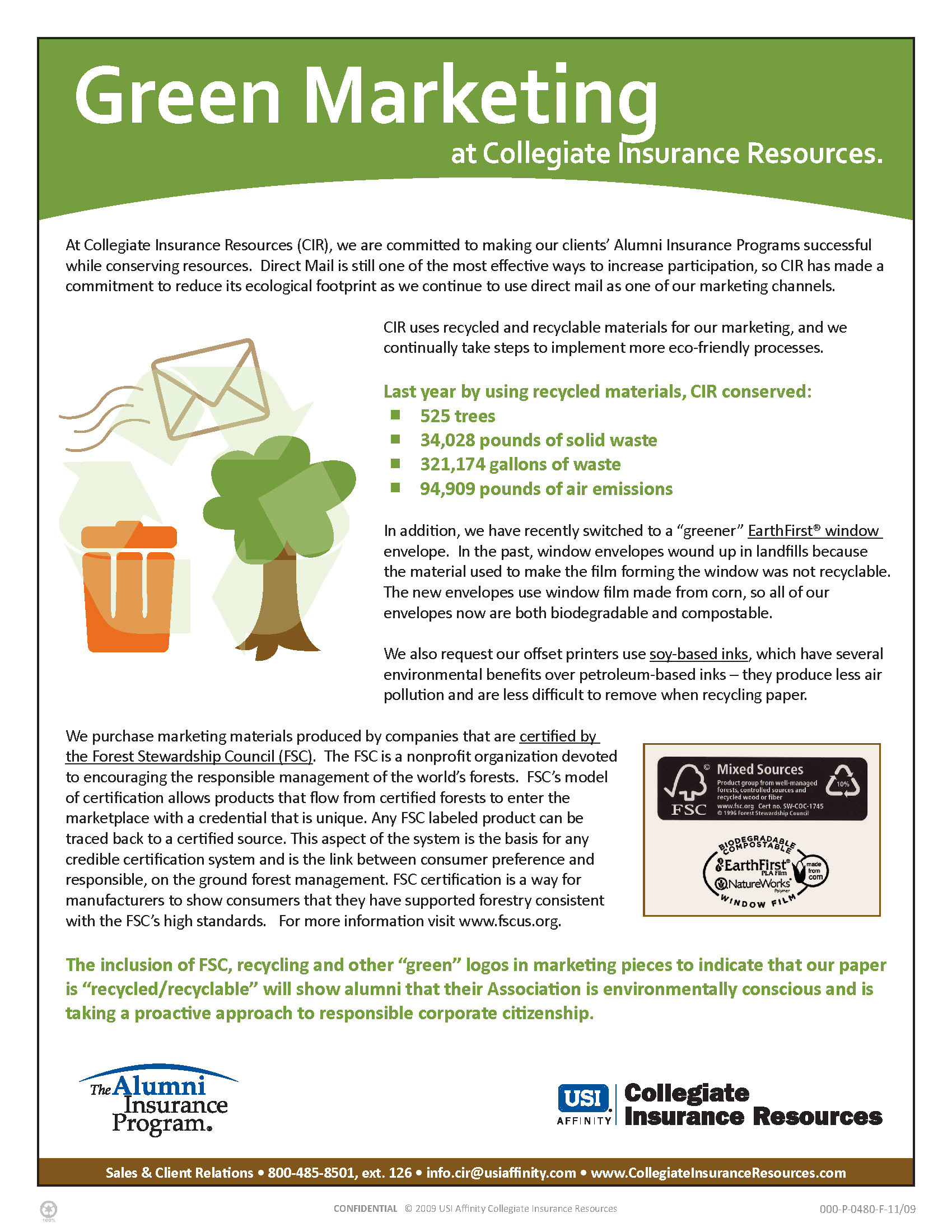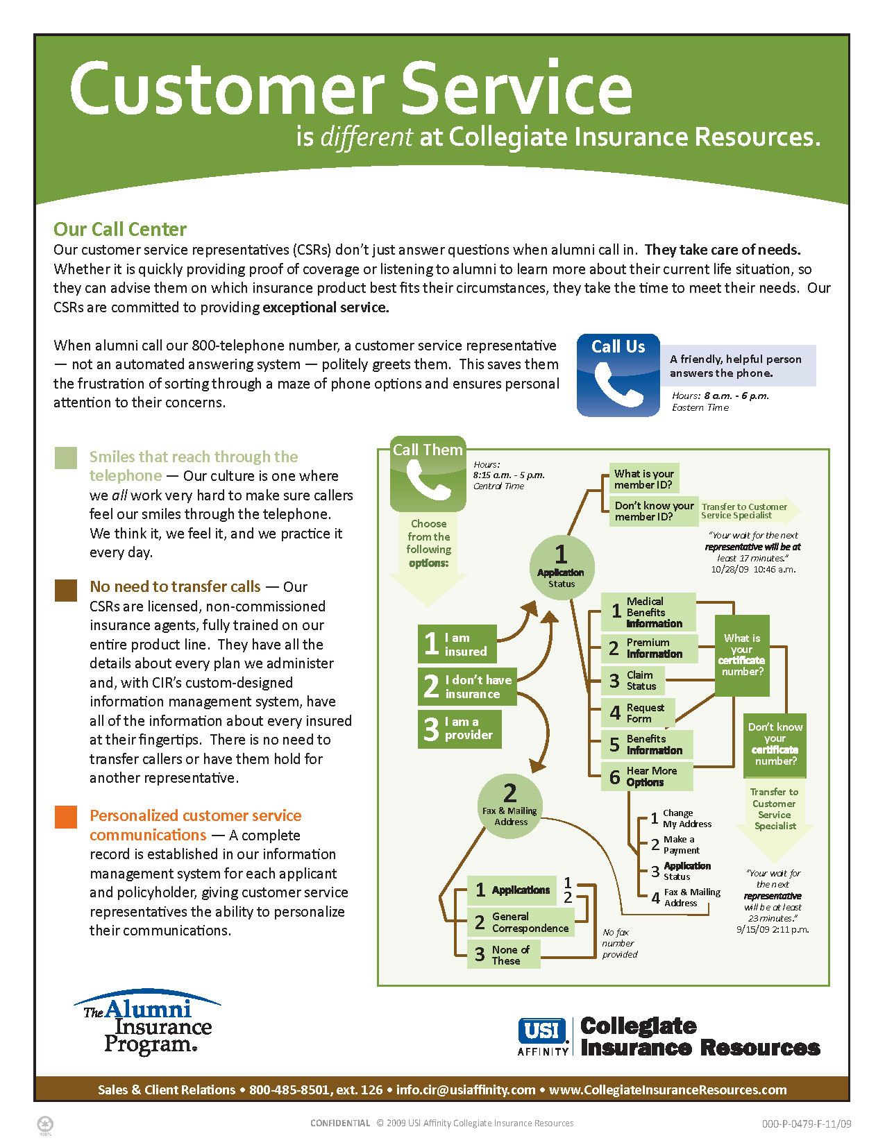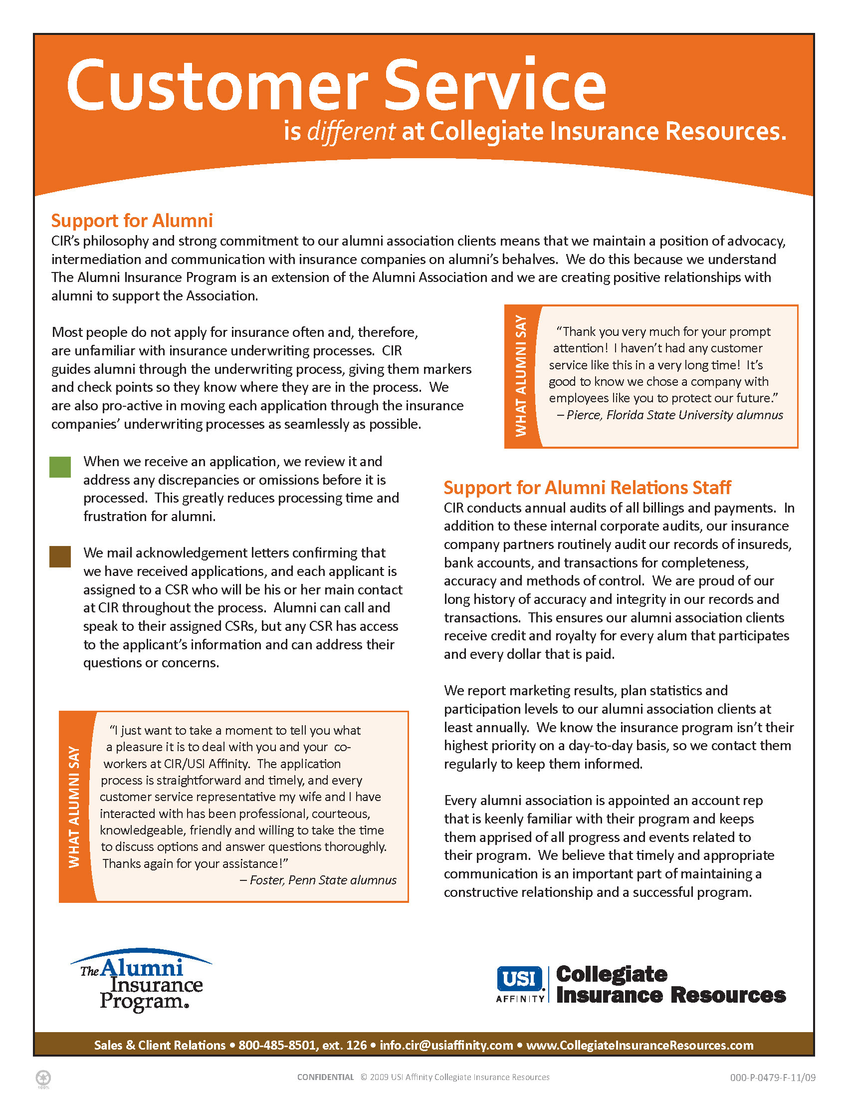 Marketing and Customer Service overview flyers for Collegiate Insurance Resources.